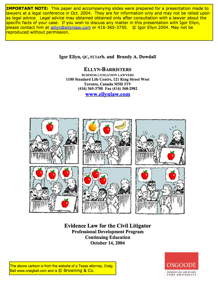 In our fast-paced world, we have very little time to get our points across. Cutting edge lawyers now, resort to graphics and images to make their presentations more persuasive and effective. The old adage that a picture is worth 10,000 words is often true. As an advocate, Igor Ellyn understands that effective persuasion is what clients expect of their lawyer. In this paper, delivered at a legal conference in October 2004, Mr. Ellyn highlights how illustrative evidence can be used to make facts of a case more persuasive at every stage of the proceedings. He also demonstrates the many forms of illustration, some of which are interesting and surprising.